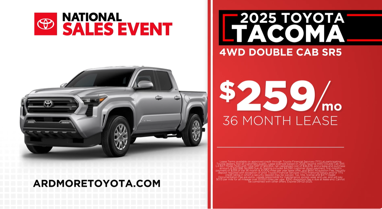 Whether you’re looking for power, style, or reliability, the 2025 Toyota Tacoma has it all, and we’re excited to offer unbeatable lease options to make it even easier for you to drive off in one. Visit us today to learn more about our special leasing offers and see the Tacoma in action. Don’t miss out on this exclusive promotion—let’s make your Toyota dreams come true this August!